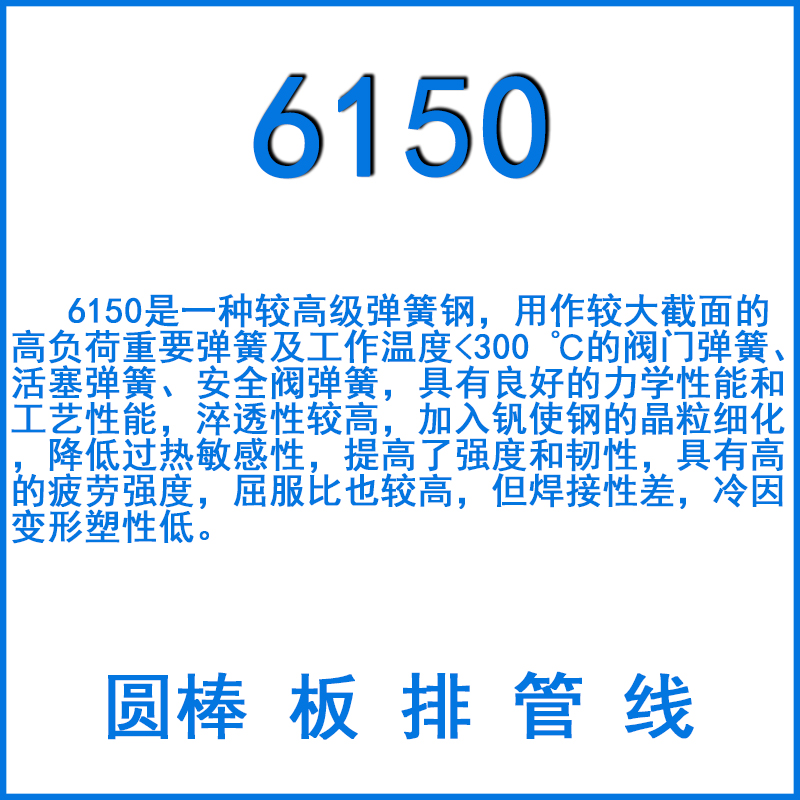 6150是一種較高級(jí)彈簧鋼,用作較大截面的高負(fù)荷重要彈簧及工作溫度<300 ℃的閥門(mén)彈簧、活塞彈簧、安全閥彈簧,具有良好的力學(xué)性能和工藝性能,淬透性較高,加入釩使鋼的晶粒細(xì)化,降低過(guò)熱敏感性,提高了強(qiáng)度和韌性,具有高的疲勞強(qiáng)度,屈服比也較高,但焊接性差,冷因變形塑性低。