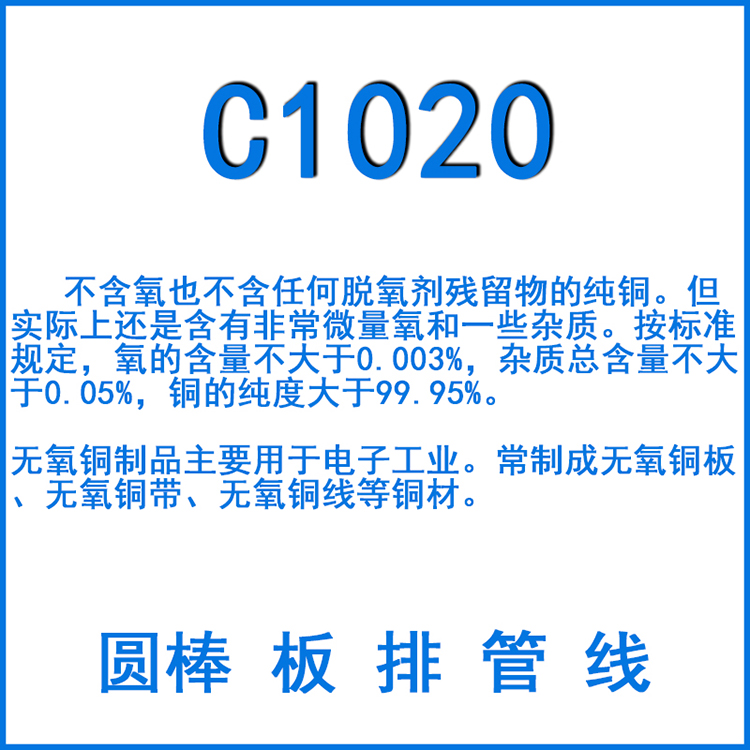 C1020無氧銅是不含氧也不含任何脫氧劑殘留物的純銅。但實際上還是含有非常微量氧和一些雜質(zhì)。按標(biāo)準(zhǔn)規(guī)定,氧的含量不大于0.003%,雜質(zhì)總含量不大于0.05%,銅的純度大于99.95%。根據(jù)含氧量和雜質(zhì)含量,無氧銅又分為一號和二號無氧銅。一號無氧銅純度達到99.97%,氧含量不大于0.003%,雜質(zhì)總含量不大于0.03%;二號無氧銅純度達到99.95%,氧含量不大于0.003%,雜質(zhì)總含量不大于0.05%。