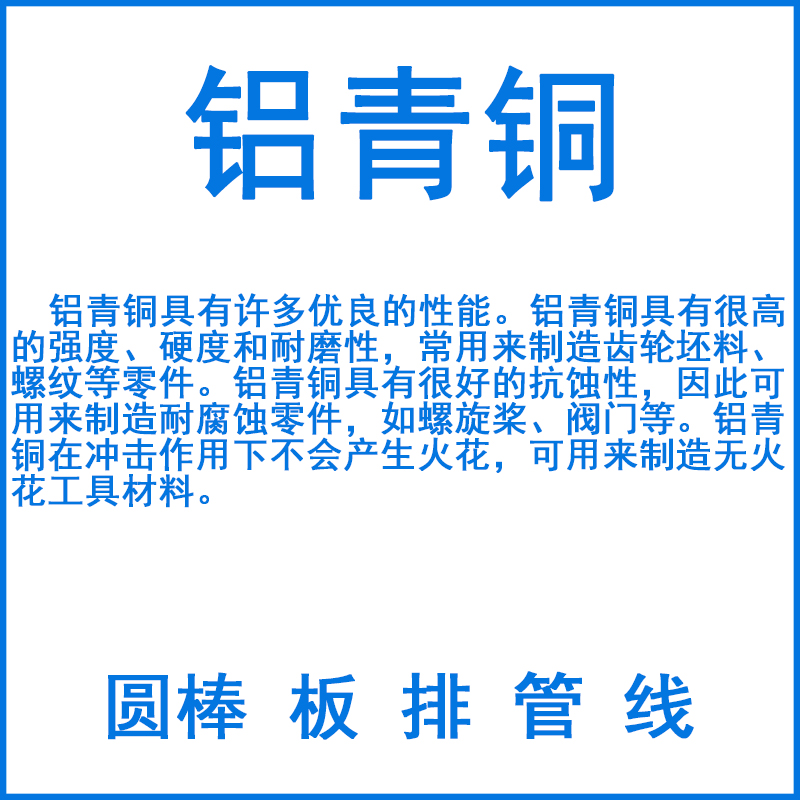 含鋁量一般不超過11.5%,有時還加入適量的鐵、鎳、錳等元素,以進一步改善性能。鋁青銅可熱處理強化,其強度比錫青銅高,抗高溫氧化性也較好。